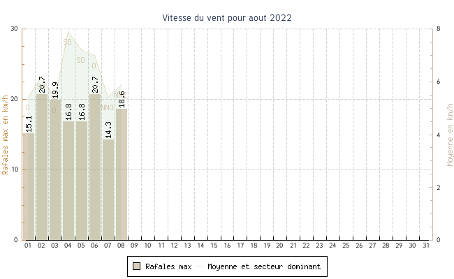 | min | max | moy | Vitesse (rafales) | Secteur | ||